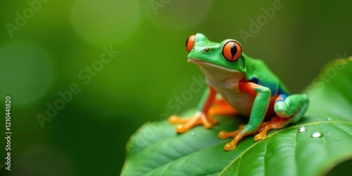 Vibrant Green Frog with Striking Orange Accents Perched on a Lush Green Leaf, Dew Drops Glistening, a Captivating Display of Nature's Beauty