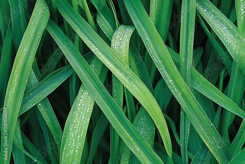 Vibrant green grass blades covered in tiny water droplets from the morning dew.