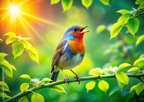 Vibrant Green Leaves and a Singing Bird in Soft Sunlight - Nature's Serenity Captured in Panoramic Photography