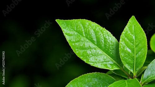 Vibrant Green Leaves: Close-up of lush, glossy green leaves, showcasing intricate details against a dark backdrop.