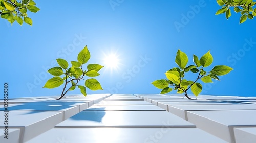 Vibrant Green Leaves Emerging from Modern White Building Facade Under Sunny Sky