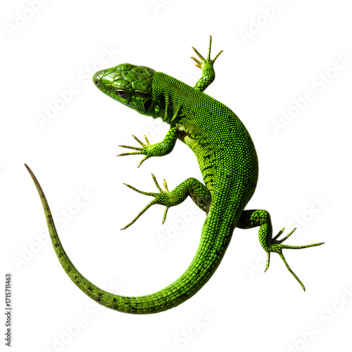 Vibrant green lizard with detailed scales poised against a dark void, showcasing nature's intricate design