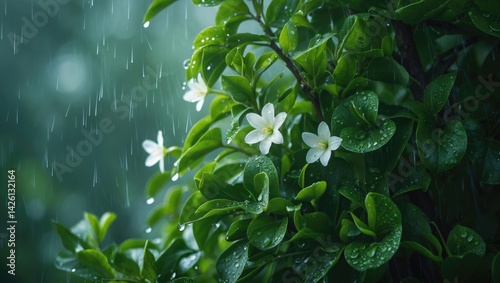 Vibrant green orange tree leaves with raindrops and dew on blossoms