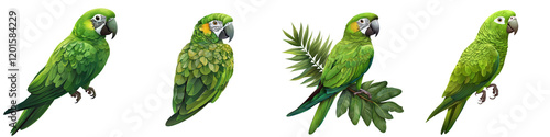 Vibrant Green Parrots Perched on Tropical Foliage Branch
