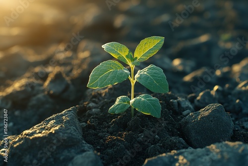 vibrant green sprout emerging from rich soil under diffused sunlight