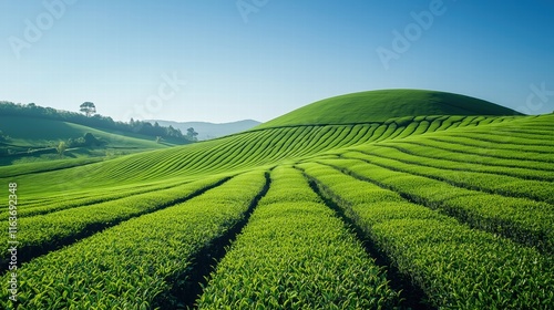 Vibrant green tea fields with neatly aligned rows on rolling hills under a bright blue sky. A picturesque landscape symbolizing sustainable agriculture and natural harmony.