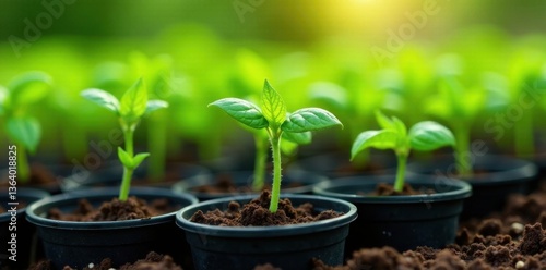 Vibrant green tomato seedlings in black plastic pots, ready for transplanting , green leaves, farm, sun