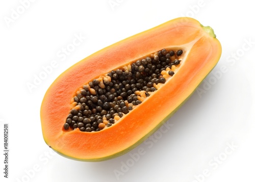 Vibrant half papaya showcases seed-filled core and rich orange flesh