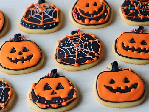 Vibrant Halloween Cookies with Intricate Jack o Lantern and Spider Web Designs