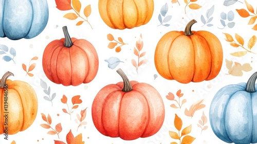 Vibrant Harvest Mosaic: A Kaleidoscopic Tapestry of Multicolored Pumpkins and Variegated Autumn Leaves Scattered in a Playful Seasonal Pattern"