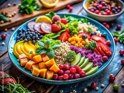 Vibrant Healthy Meal: Colorful Plate of Fresh Fruits, Vegetables, and Grains