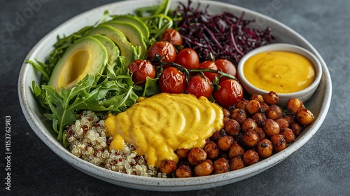 Vibrant healthy quinoa bowl with avocado, chickpeas, roasted tomatoes, and a creamy turmeric dressing.