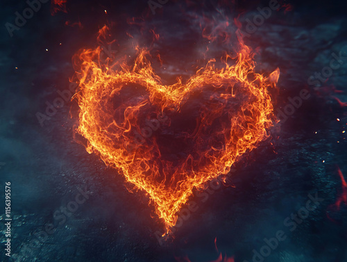 Vibrant heart-shaped flames and smoke glowing against a dark background, representing passion and energy.