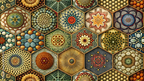 Vibrant hexagonal mosaic with intricate patterns and textured details, creating a visually stunning composition.A colorful and geometric mosaic, featuring a variety of shapes and te