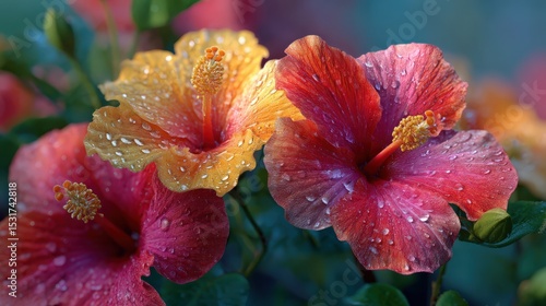 Vibrant Hibiscus Flowers with Water Droplets and Lush Greenery