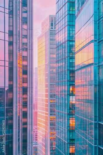 Vibrant high-rise building exterior in retro hues. Urban city background with vintage color grading, geometric windows, and modern architectural design.