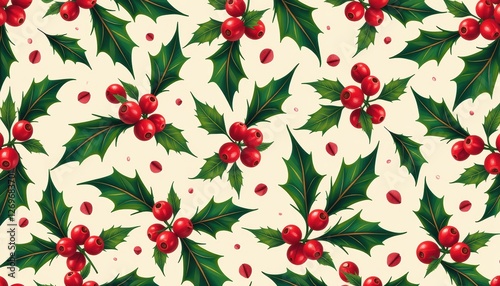 Vibrant Holly Leaves and Berries Pattern on Cream Background for Festive Holiday Decorations. A pattern of holly leaves and berries on a beige background.