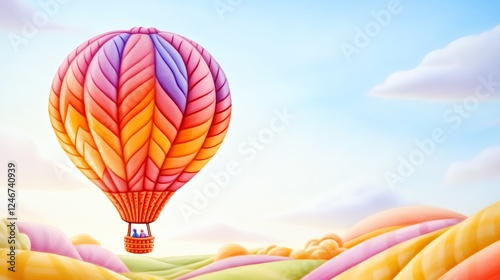 Vibrant Hot Air Balloon Soaring Over Pastel Hills