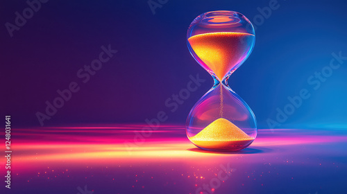 Vibrant hourglass, sand flowing, neon background. Time, deadline, urgency concept.