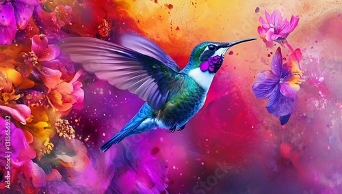 Vibrant Hummingbird Amidst Colorful Flowers in a Dreamlike Abstract Background : Generative AI