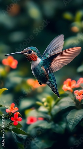 Vibrant Hummingbird in Flight Amidst Lush Green Foliage and Red Flowers