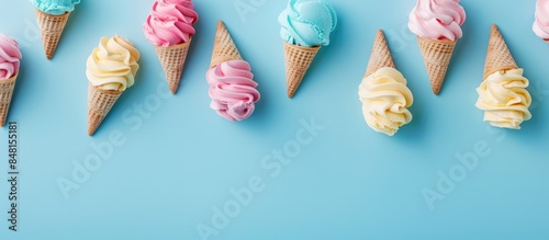 Vibrant ice cream design on soft blue backdrop. Playful and chic summer flat lay.