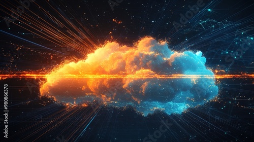Vibrant Illuminated Cloud: A Striking Poster for Modern Sports Decor, Showcasing Bright Colors and Abstract Shapes in a Digital Landscape Transitioning from Blue to Orange.