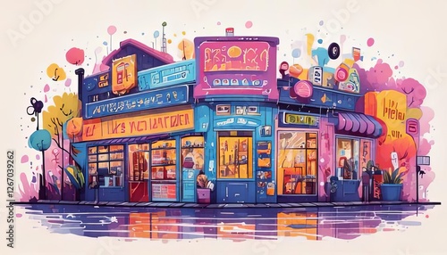 Vibrant Illustrated Storefront in a Lively Urban Setting