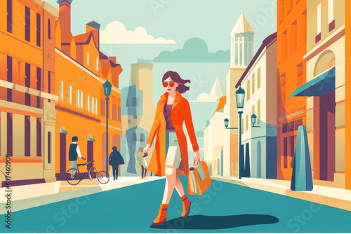 Vibrant illustration featuring a joyful female tourist exploring Sydney's lively streets, exuding a colourful Australian adventure.