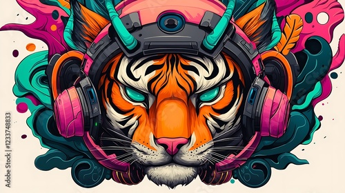 Vibrant illustration of a tiger wearing headphones, surrounded by colorful abstract patterns