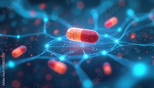 Vibrant illustration pharma capsule represents future pharmaceutical industry. Scientific concept AI-driven drug discovery, personalized medicine, genomics, biotech, healthcare tech. Medicine