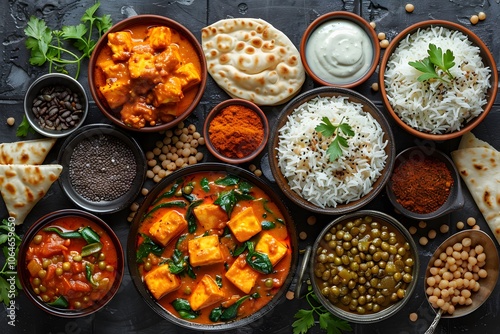 Vibrant Indian Cuisine Spread with Paneer, Spices, and Naan for Culinary Delight
