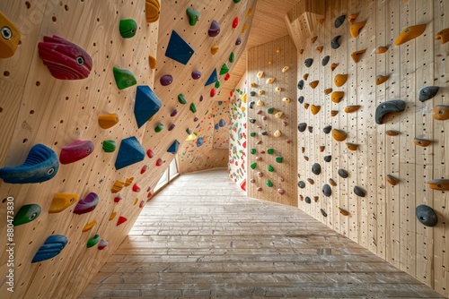 Vibrant indoor rock climbing gym with colorful climbing holds and tall walls.