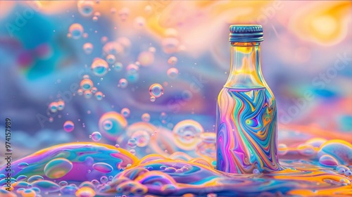 Vibrant Iridescent Bottle Amidst Colorful Abstract Bubbles and Swirls