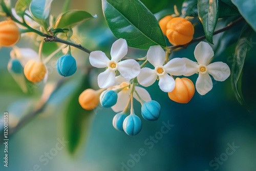 Vibrant Jasmine Tree Branch with Multicolored Flowers, Leaves, and Turquoise Fruits in Sunlight