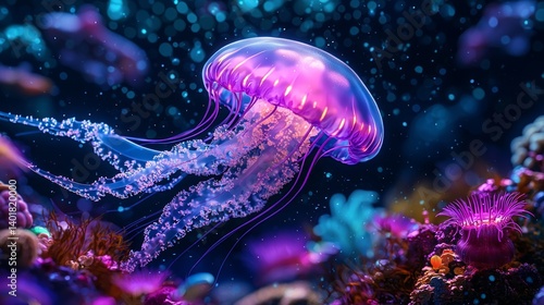 Vibrant Jellyfish Glowing Beneath Water Surface with Colorful Corals