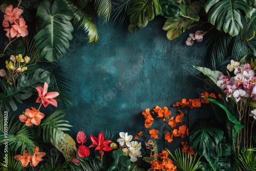 Vibrant jungle greenery and flowers, dining experience set against an artistic city wall. Richly colored background. Designs for wall prints, murals, stationery. Modern and traditional decor