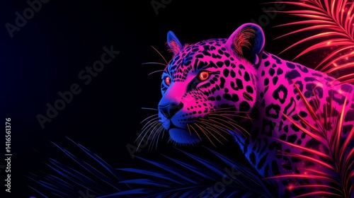 Vibrant jungle predator under neon illumination exotic nature illustration featuring a striking leopard bathed in radiant magenta and electric blue hues in a darkness wild world