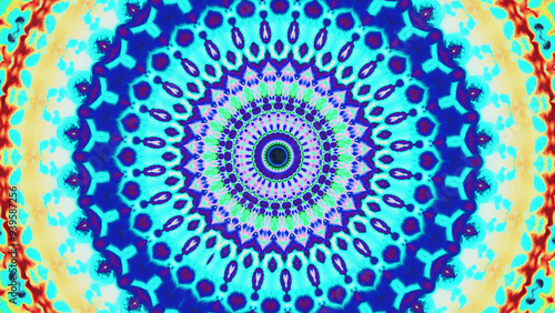Vibrant kaleidoscope mandala with intricate cyan blue red radial patterns mesmerizing details art illustration abstract background.