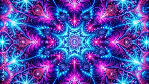 Vibrant, kaleidoscopic swirls of neon pink, blue, and purple hues blend with fractal patterns, creating a mesmerizing,
