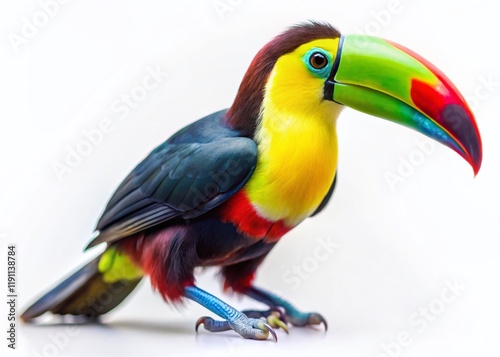 Vibrant Keel-Billed Toucan, Central American Bird, Long Exposure, White Background Stock Photo