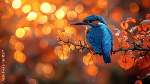 Vibrant kingfisher perched on autumn branch, sunset bokeh.
