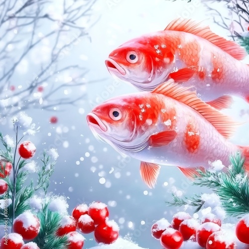 Vibrant koi fish in a snowy winter wonderland with red berries and pine branches