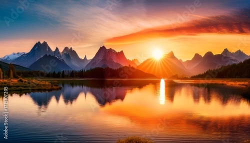Vibrant Landscape Painting Of Mountains And Rising Sun Reflecting In Water