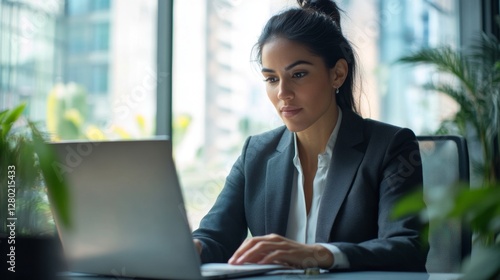 Vibrant Latina Woman in Business Attire Working on Laptop