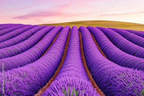 Vibrant Lavender Fields at Sunset with Rolling Hills in the Background, Ideal for Nature and Travel Themes.