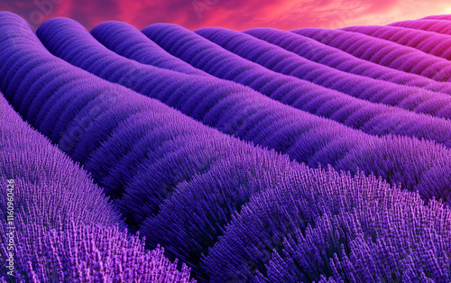 Vibrant Lavender Fields at Sunset with Rows of Blooming Flowers and Dramatic Sky. Flowers background