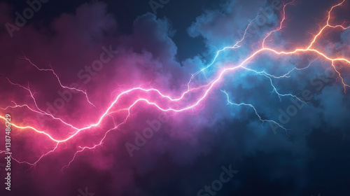 Vibrant lightning strikes illuminate dark clouds in dramatic display. electric colors create stunning visual effect