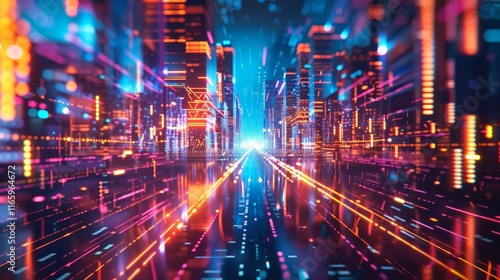 Vibrant lights illuminating a futuristic cityscape with towering buildings and glowing light trails, creating a mesmerizing night scene