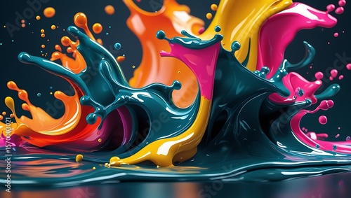 Vibrant liquid splashes of teal yellow and pink paint in motion